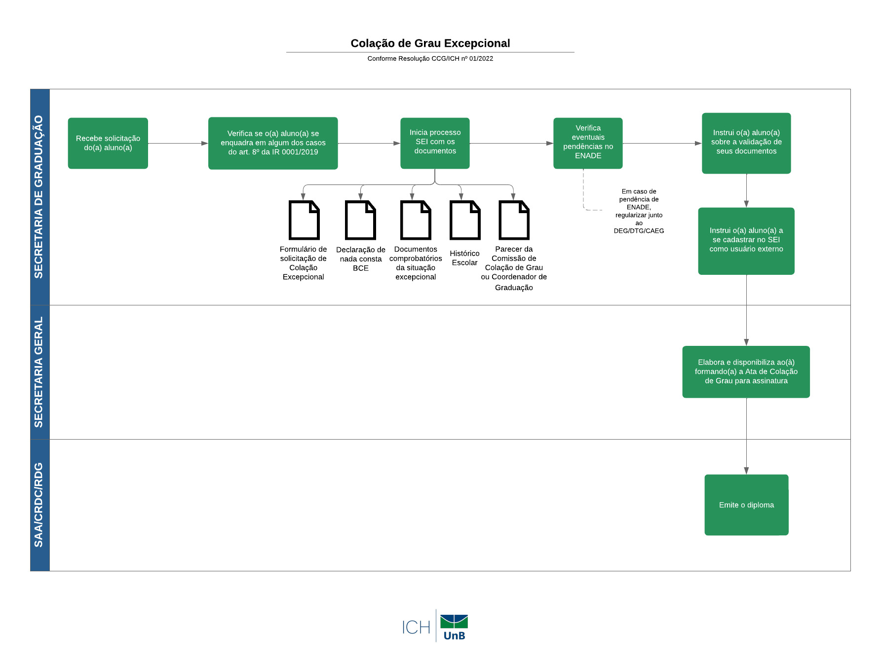 Conforme disposto na Resolução CCG/ICH nº 01/2022, a Colação de Grau Excepcional é o procedimento pelo qual se outorga o grau ao discente formado que se enquadra em qualquer das hipóteses previstas no art. 8º da Instrução da Reitoria nº 001/2019 em data distinta à cerimônia de colação de grau tradicional ou remota. São elas: